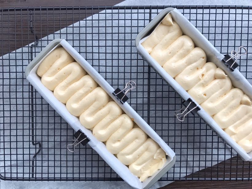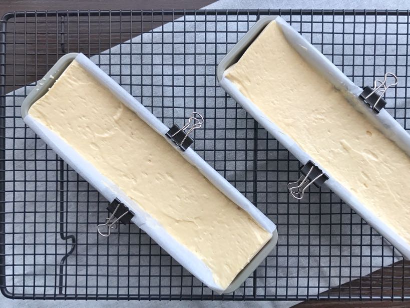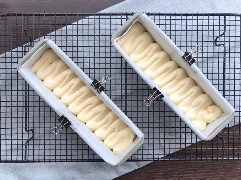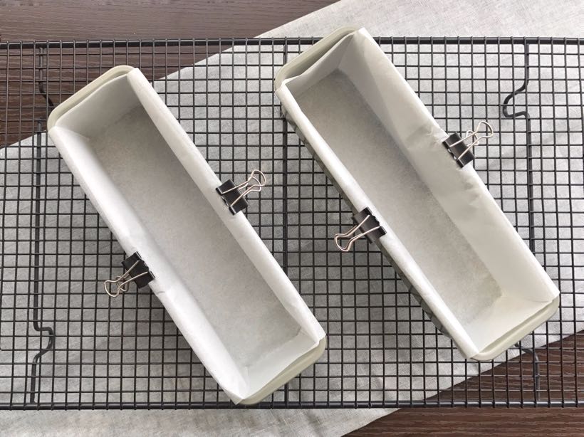 两条三能模具垫好油纸备用。我比较手笨,所以一般会利用反尾夹固定油纸,这样油纸不容易往中间倒伏,填面糊的时候省力哈;