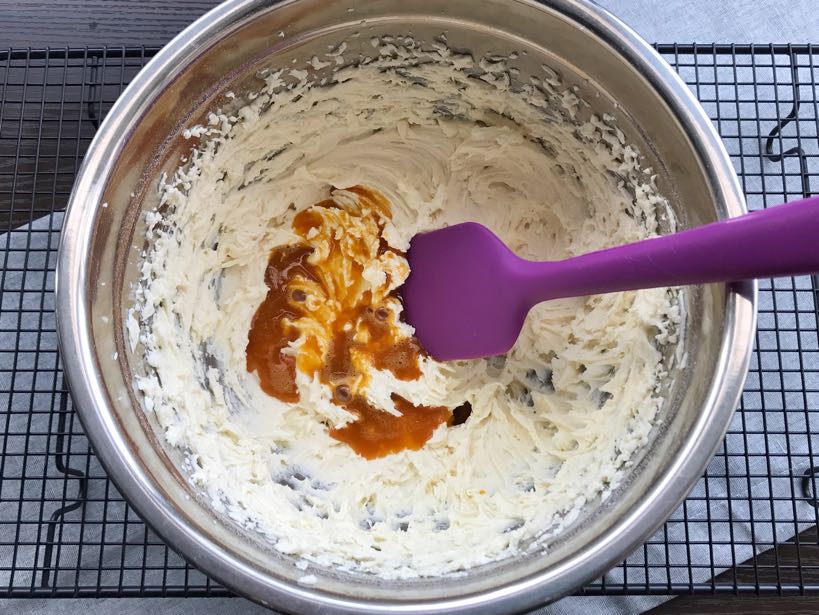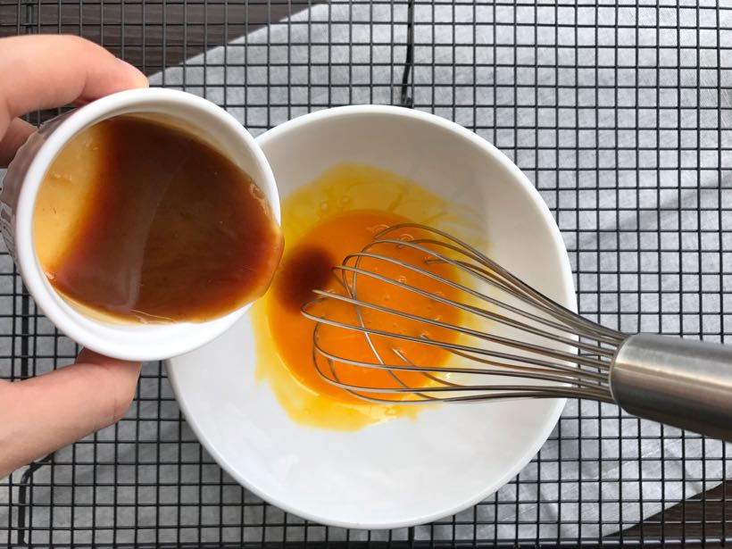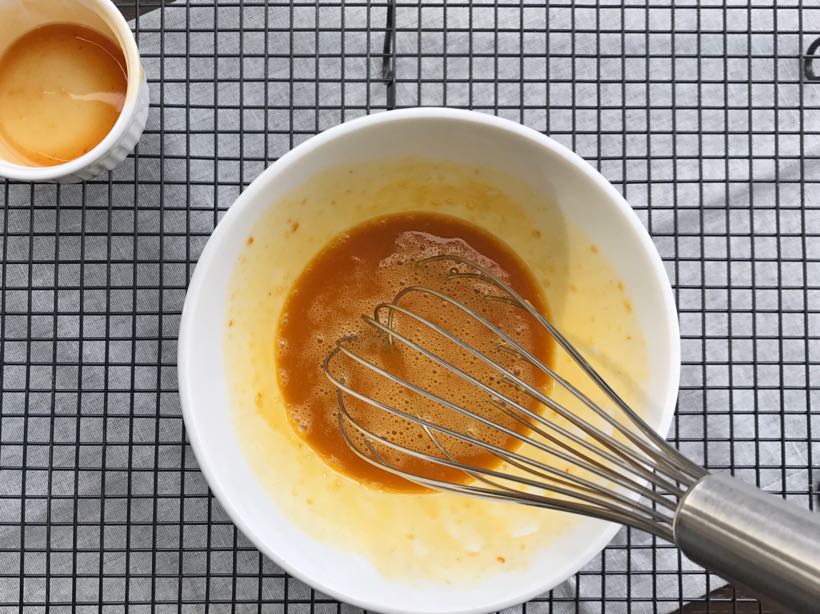 蛋黄搅散,加入第1步放凉的焦糖浆彻底搅匀;