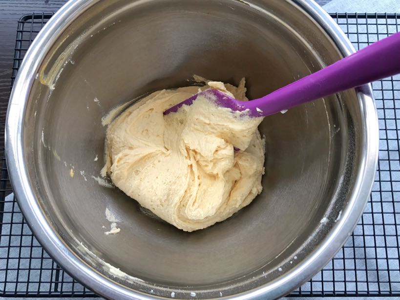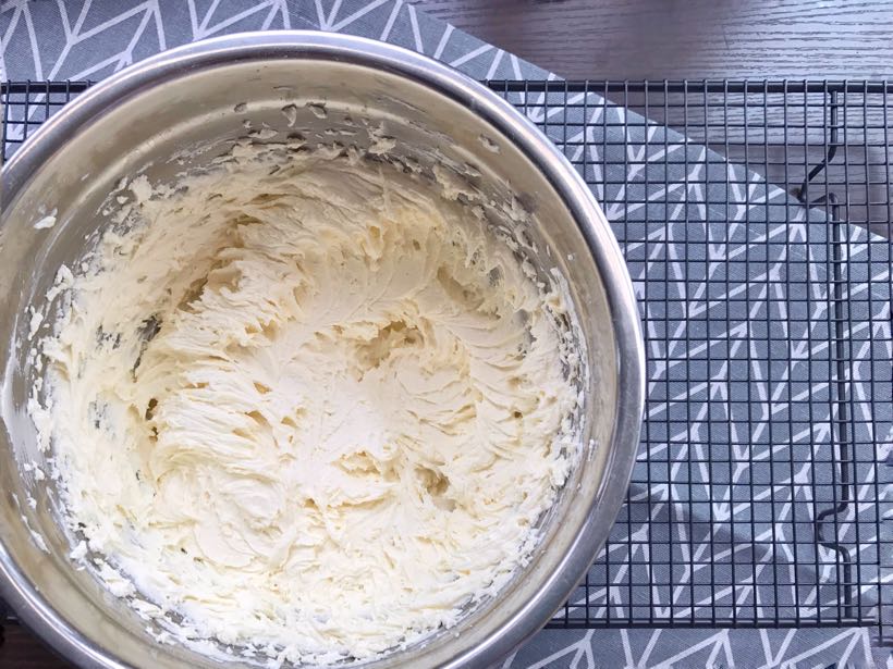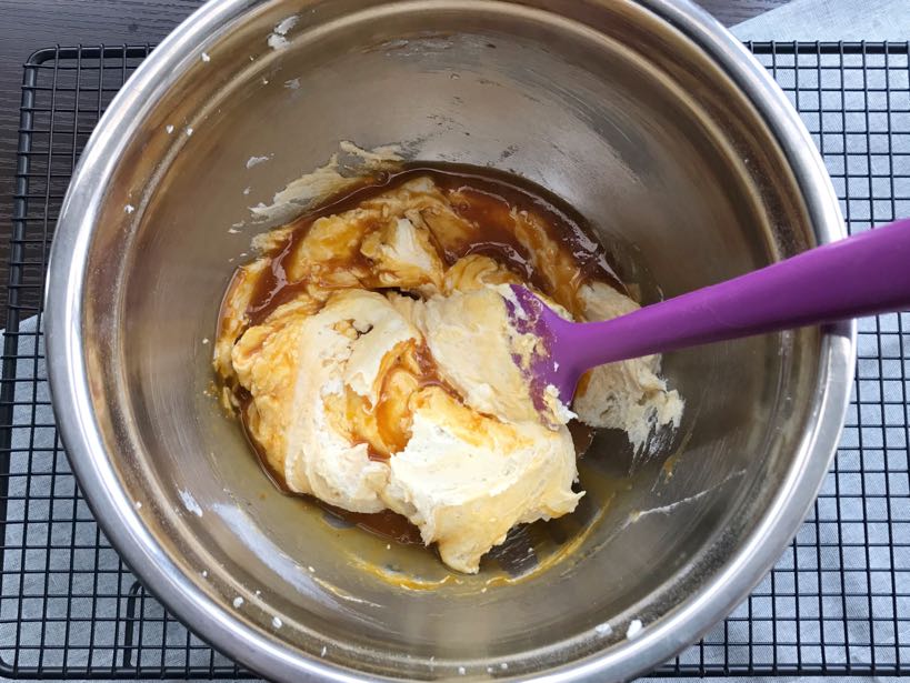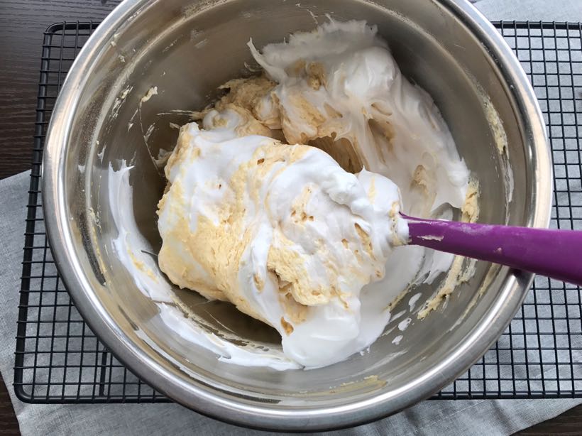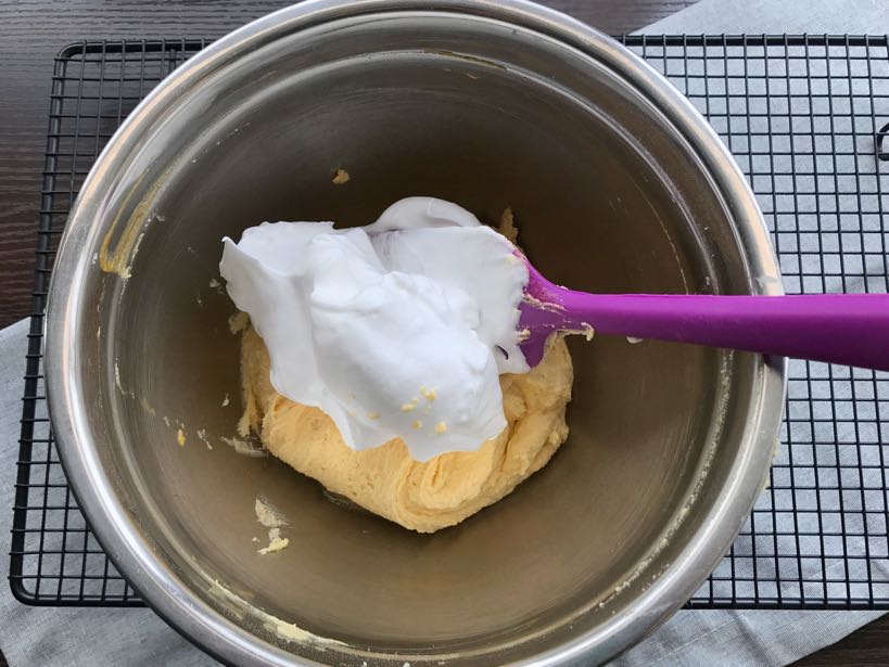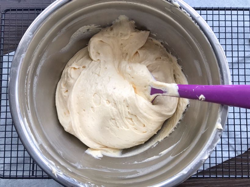 接着分3次将蛋白霜拌入黄油霜中,拌好的面糊应该是膨松有弹性的状态;