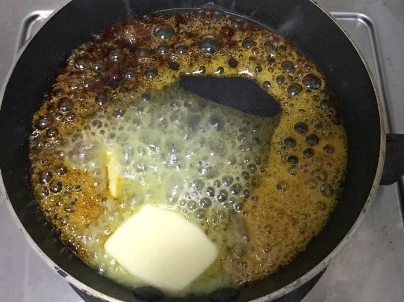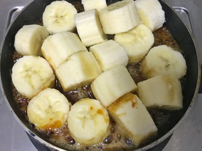 将砂糖倒入不粘平底锅中,小火熬成焦糖,然后加入少量黄油化开。接着加入香蕉段,大概每分钟翻面一次,直到香蕉煎软、上色即可关火;