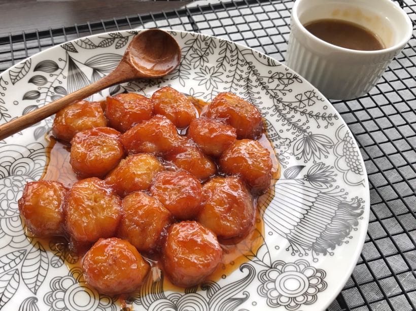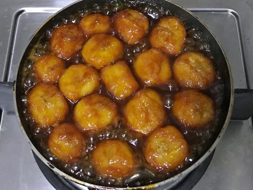 将煎好的焦糖香蕉取出。嗯……这回香蕉煎得有点软了,不太上镜。虽然这样好吃,但想要卖相好的话可以适当少煎一会儿,就会更成形。锅中剩余的焦糖浆不要倒掉,取35克放凉备用。如果不足35克,则用温水补足;