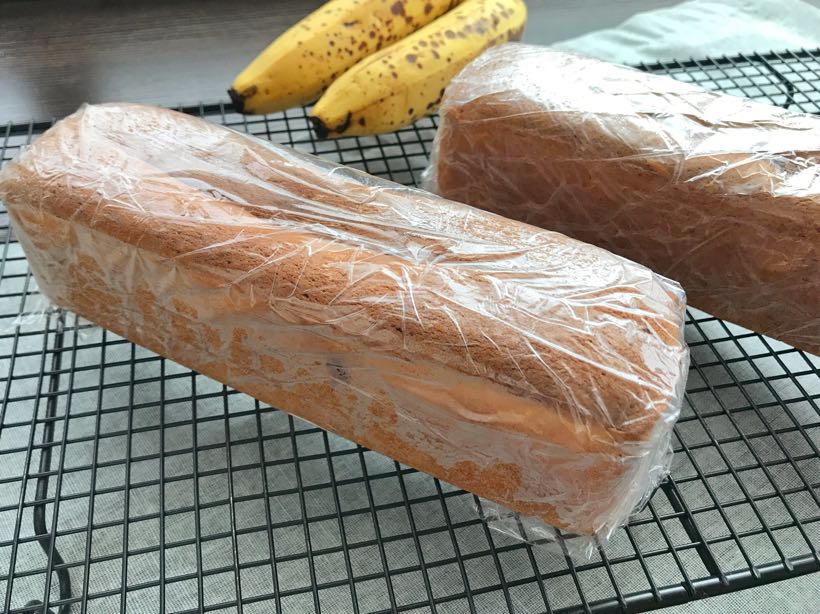 出炉后留在模具里冷却10分钟之后再脱模,用保鲜膜包紧。这样冷却之后蛋糕体不会干,还是有湿润感。这个蛋糕因为有香蕉夹心,当天就可以切开吃,第二天味道更融合一点,香蕉风味更明显!