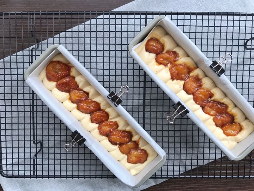 将面糊用裱花袋填入模具到一半,加入焦糖香蕉段,再继续填面糊到8分满,抹平即可;