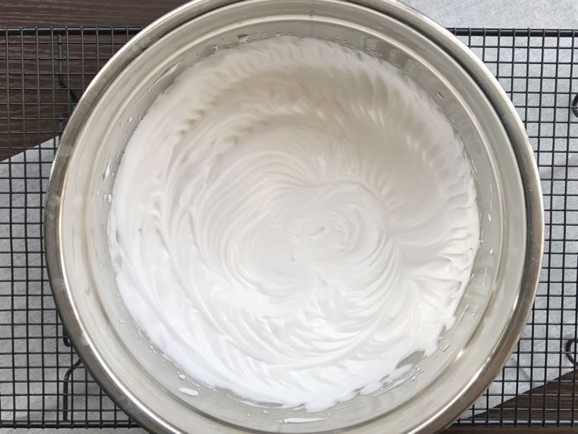 预热烤箱上下火170度,然后将蛋白分3次加糖,打至湿性发泡;
