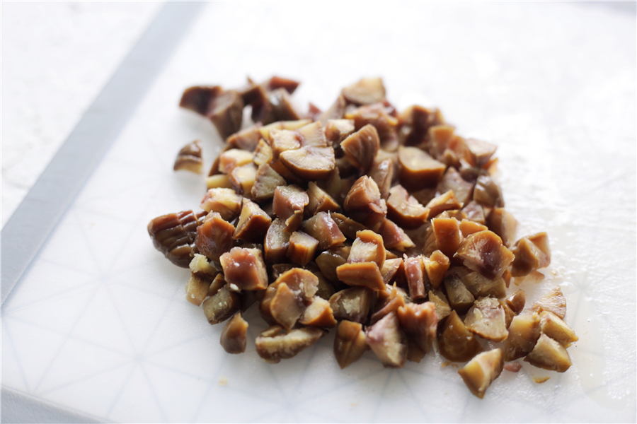 栗子切小丁,大小约一颗切成8-10个小丁;