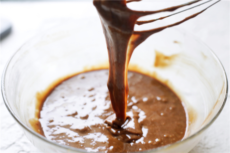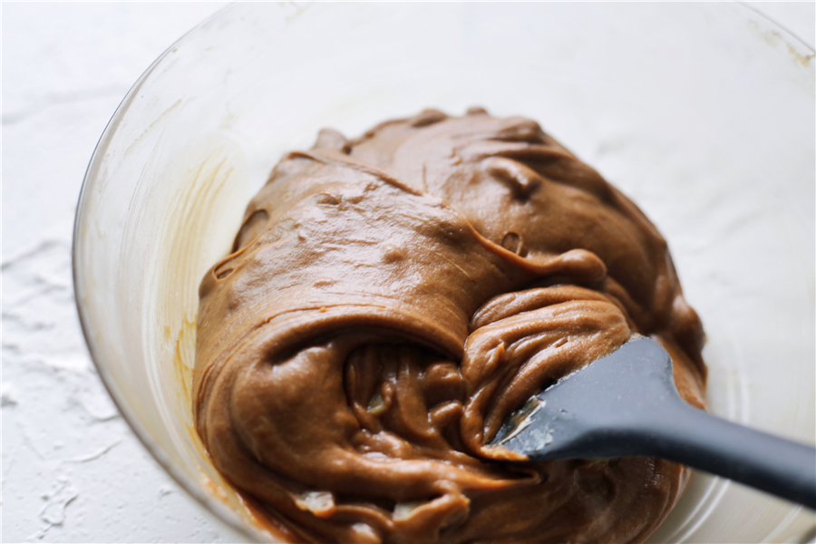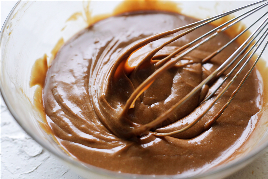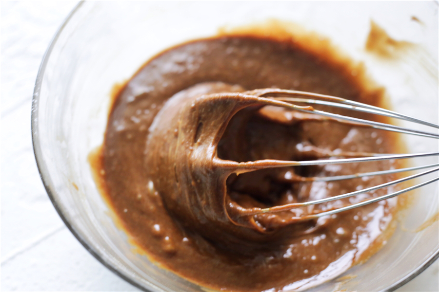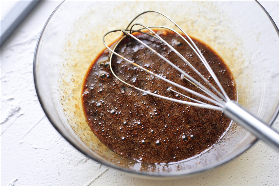 黄油与黑糖混合放入碗中,用微波炉10秒、10秒加热直到融化成液体,或隔热水加热至融化成液体,放至手温备用;