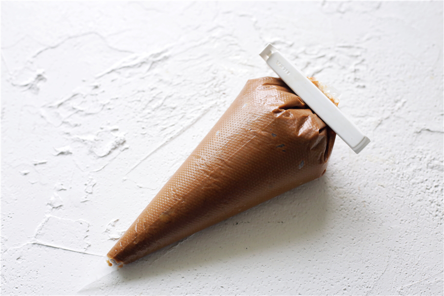 倒入栗子丁,用刮刀翻拌均匀;将面糊装进裱花袋,放入冰箱冷藏室静置1小时(也可以过夜);