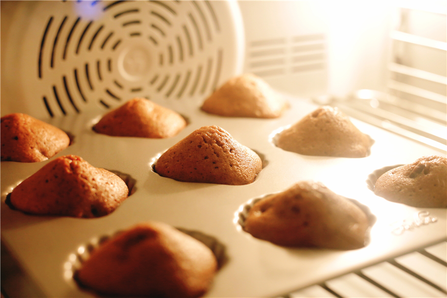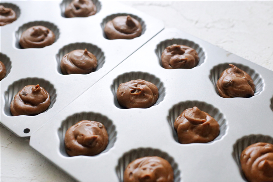 烤箱预热180℃;将面糊取出,室温放置到回软,可以轻松挤出的程度。挤在玛德琳模具中,8分满(不是防粘模具的话记得涂油撒粉哦);