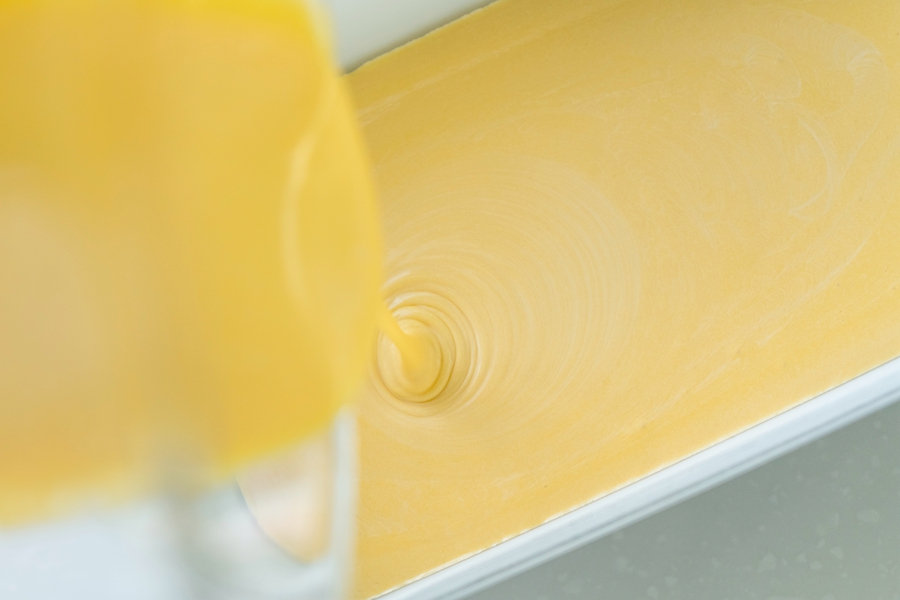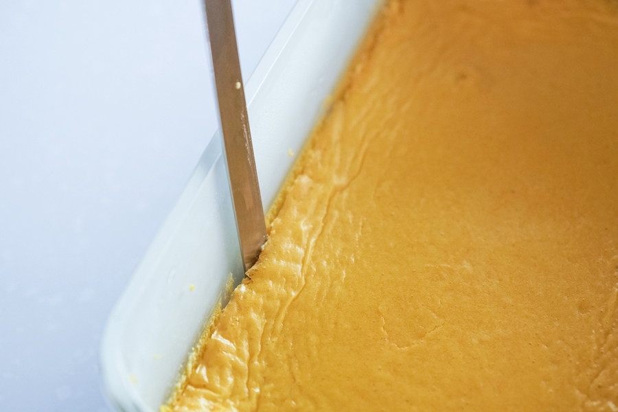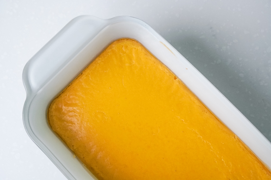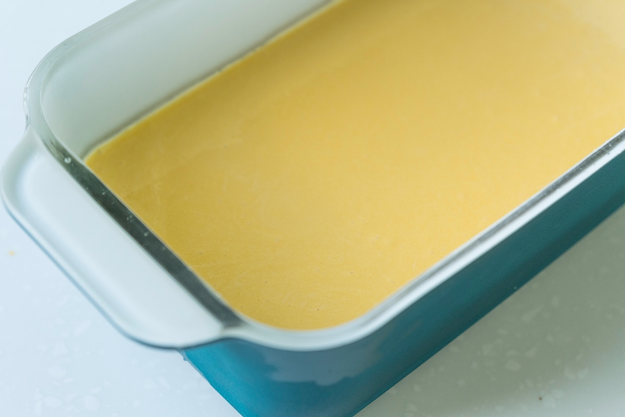 室温晾凉后冷藏2-3小时就可以脱模切条啦!