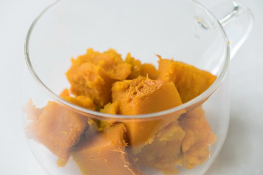 300-500g生南瓜去皮去瓤切小块,覆上扎洞的保鲜膜高火叮5分钟至熟透。如果你买的南瓜太硬了不好去皮,可以先切小块去叮熟,再用勺子去皮,这样也比较安全省力;
