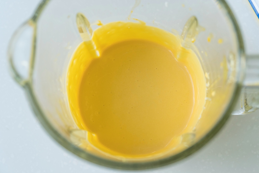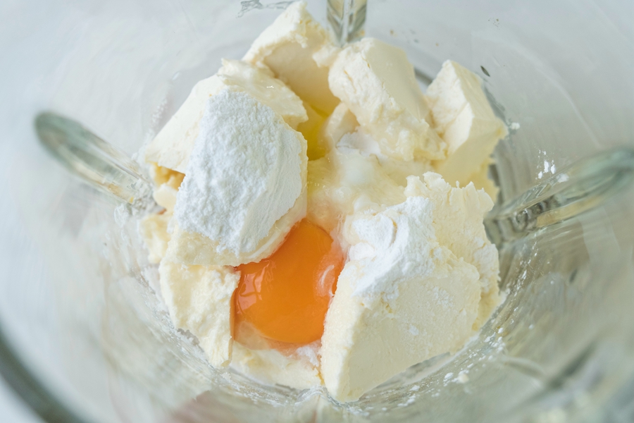 晾凉的南瓜用纱布滤去多余水分,称出150g,与奶酪、奶油、糖、鸡蛋、淀粉一起倒入搅拌机中,打至细腻;