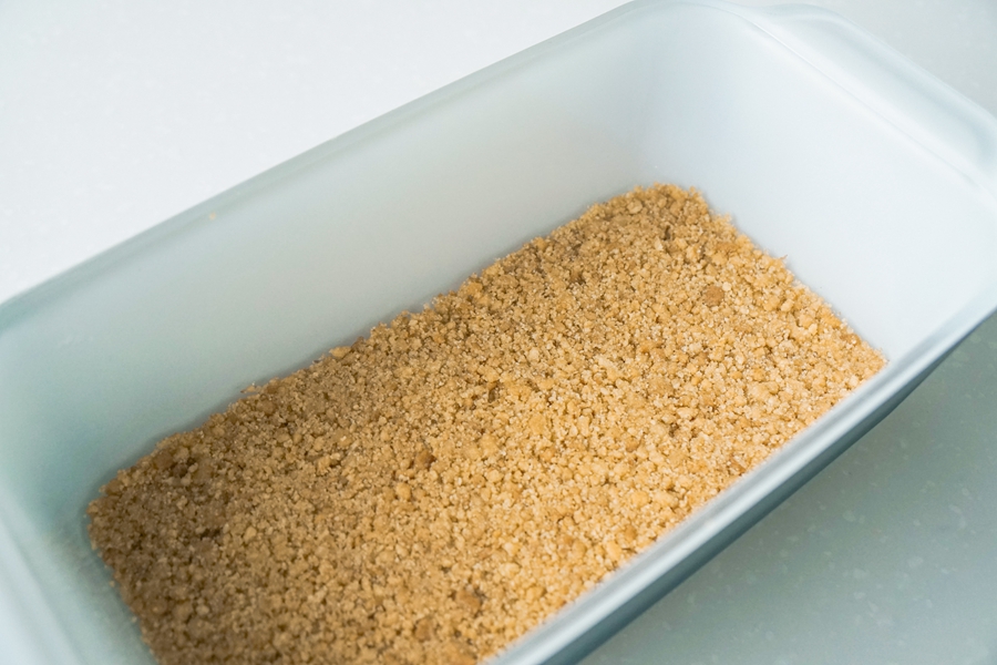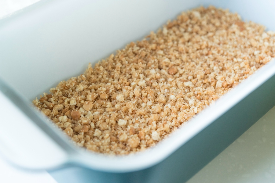 黄油加热融化,消化饼敲碎,混合铺进模具,压平冷藏;