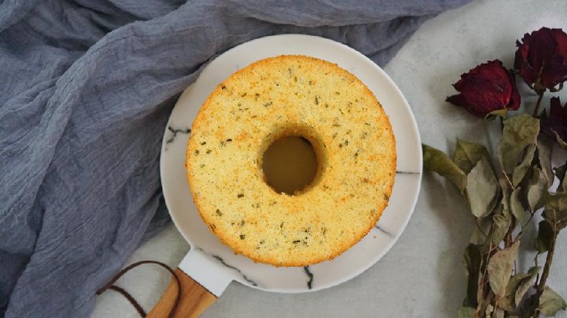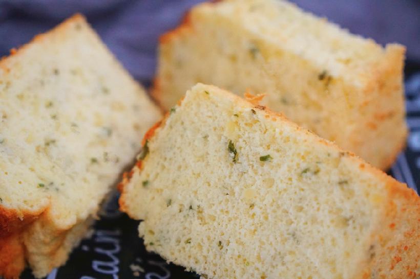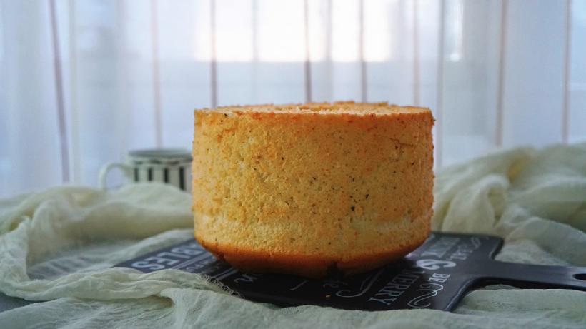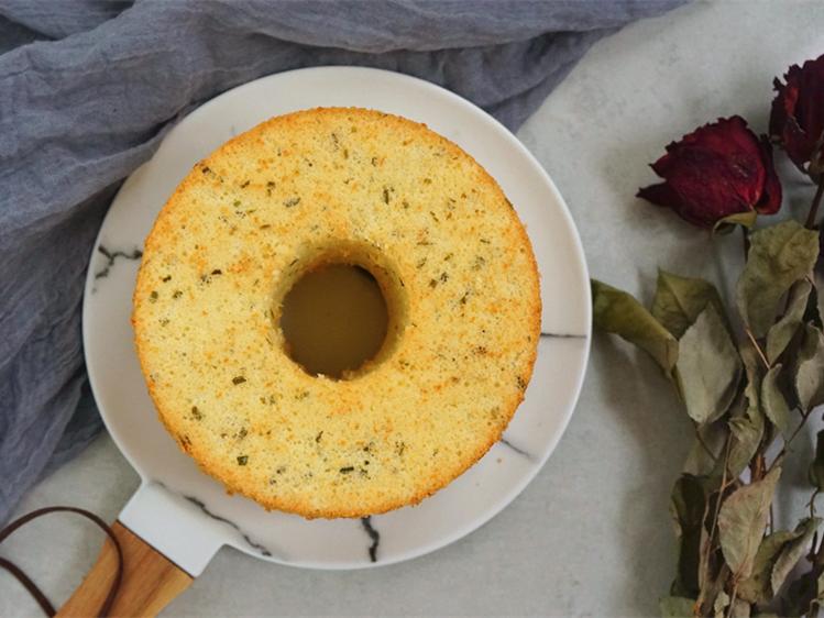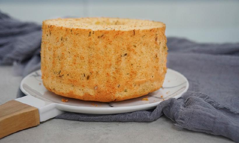 凉透之后脱模仍然是需要小心,乳酪香葱味戚风脱模会比香蕉戚风的脱模容易一些,没有那么黏,但仍然比原味的要稍难一些,大家还是要小心加耐心~脱好之后看看!虽然干酪粉的加入让蛋白消泡比较多,但高度仍旧是很感人;