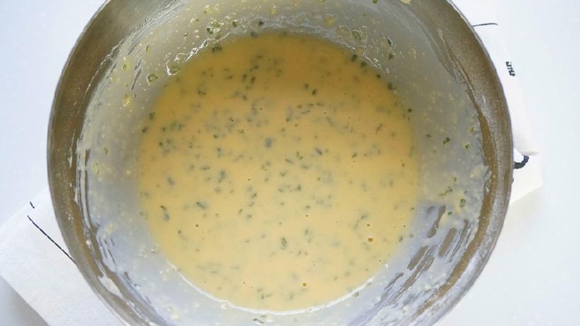 倒入干酪粉、珠葱粉,搅拌均匀(干酪粉油分真的很足,所以一定要多搅拌一下,确保均匀,不然过多的油分浮在蛋糊表面,会在混合蛋白的时候严重消泡,这样基本就告别爆炸头了);