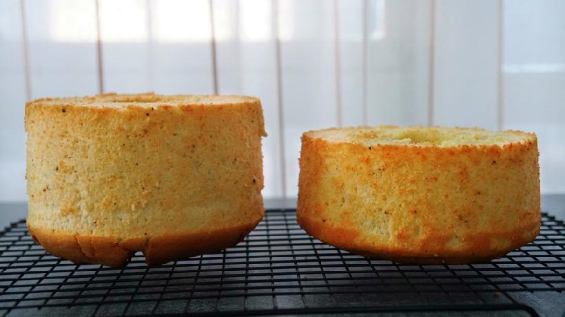 2、干酪粉与珠葱粉建议慎重增量,因为味道已经足够浓郁。尤其是干酪粉,油分真的很大,最多增到25g就足够了,再多,你的蛋白就会完全消泡了,因为干酪粉不能完全被蛋黄面糊。下图中,左边这个是25g干酪粉版本,右边是35g干酪粉版本,大家可以自己看一下高度上的对比:涨不高的蛋糕不只是没有漂亮的爆炸头,组织也会非常紧实缺乏松软感,吃起来和发糕那些差不多,失去了戚风的精髓。