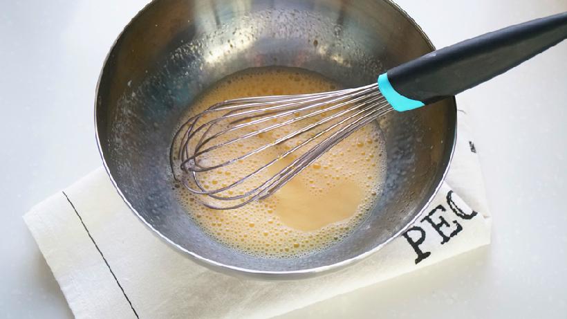 接着加入蛋黄+细砂糖A、温水,搅拌均匀;