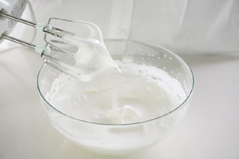 取出冷冻好的蛋白(表面有一层薄薄的冰壳为最佳状态)开始打发,分三次加糖,达到如图状态即可;