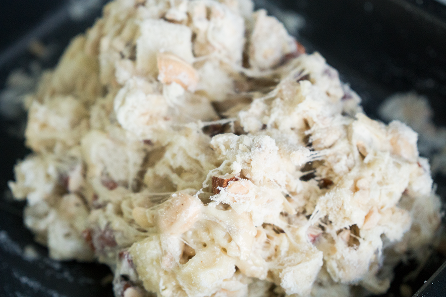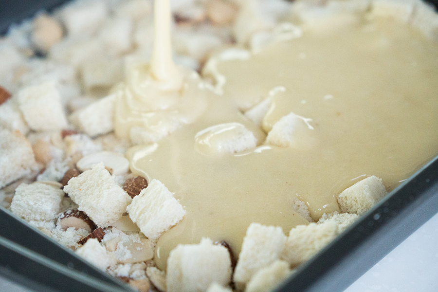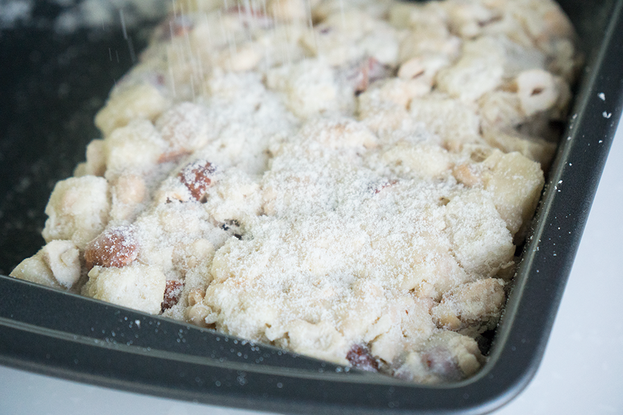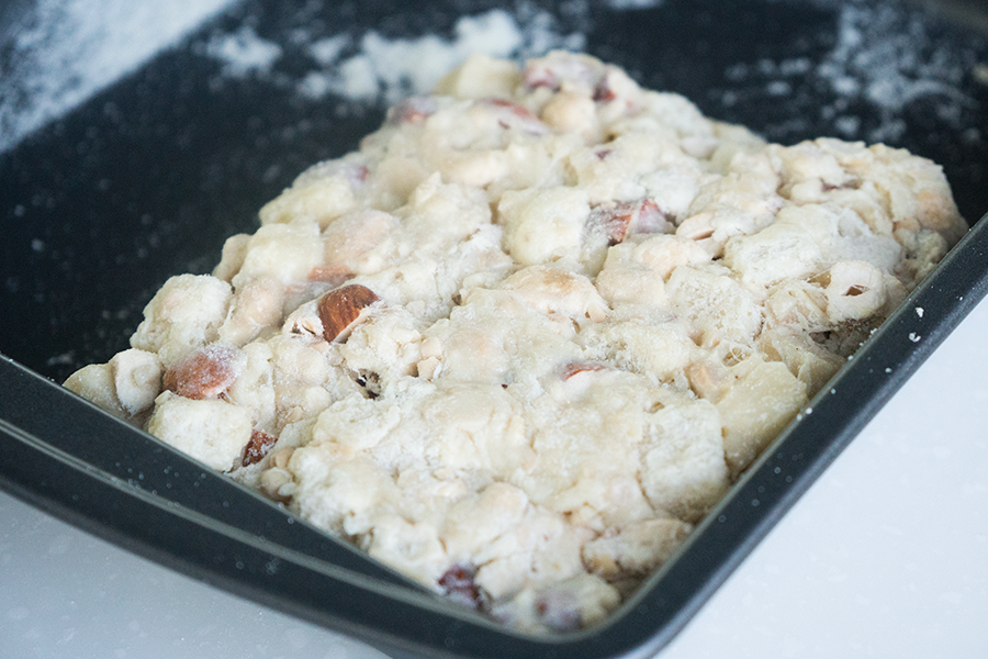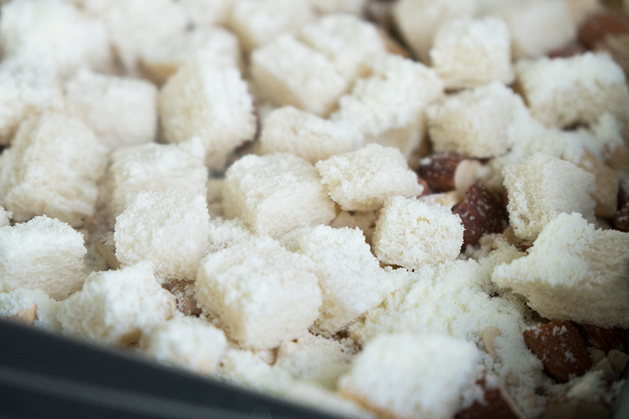 坚果烤好后取出,与面包丁混合,表面撒上奶粉后放进烤箱100℃保温备用;再准备一个小的不沾烤盘(整形用),表面撒一层奶粉防粘用;