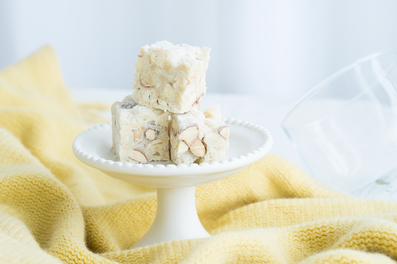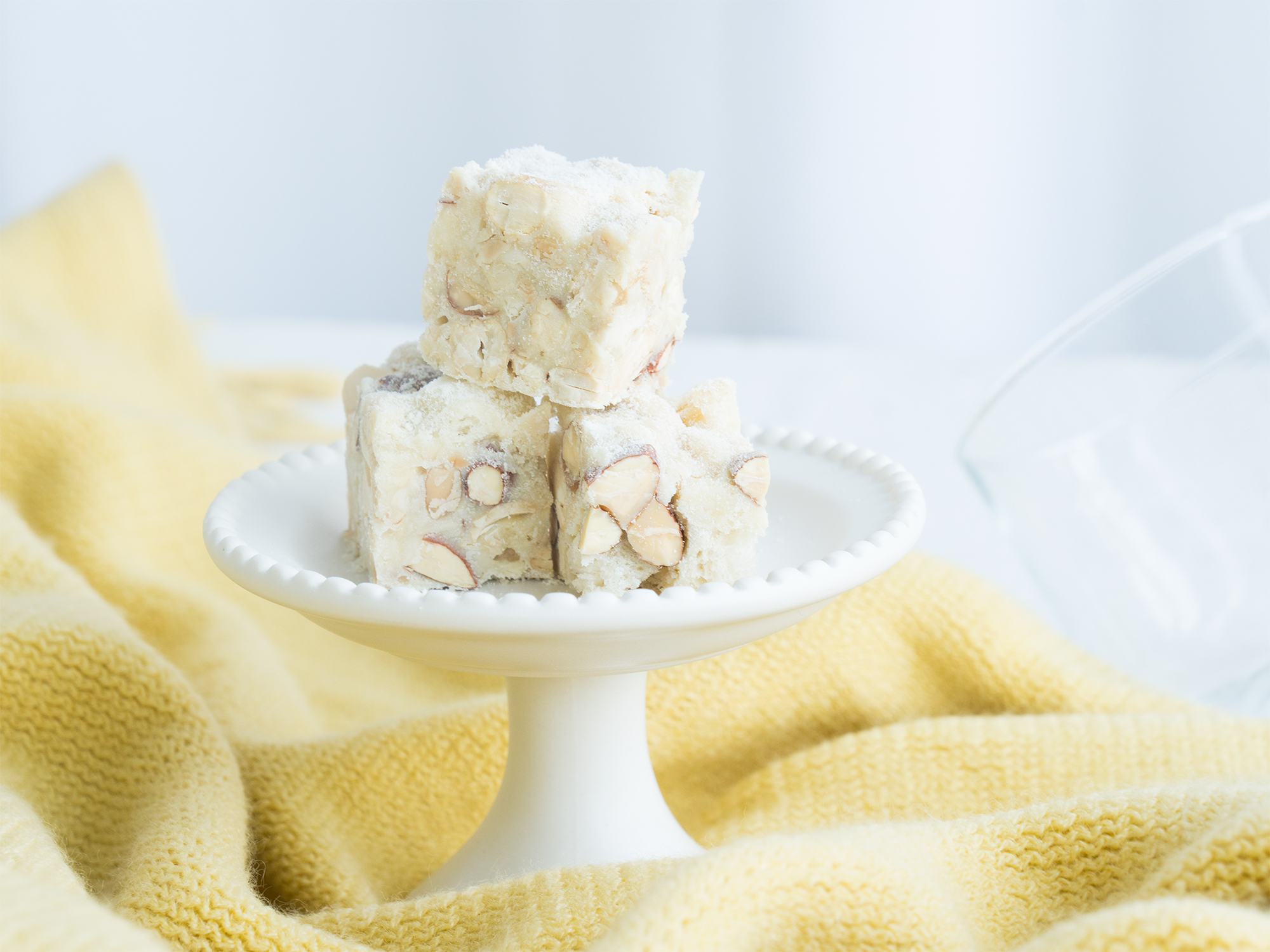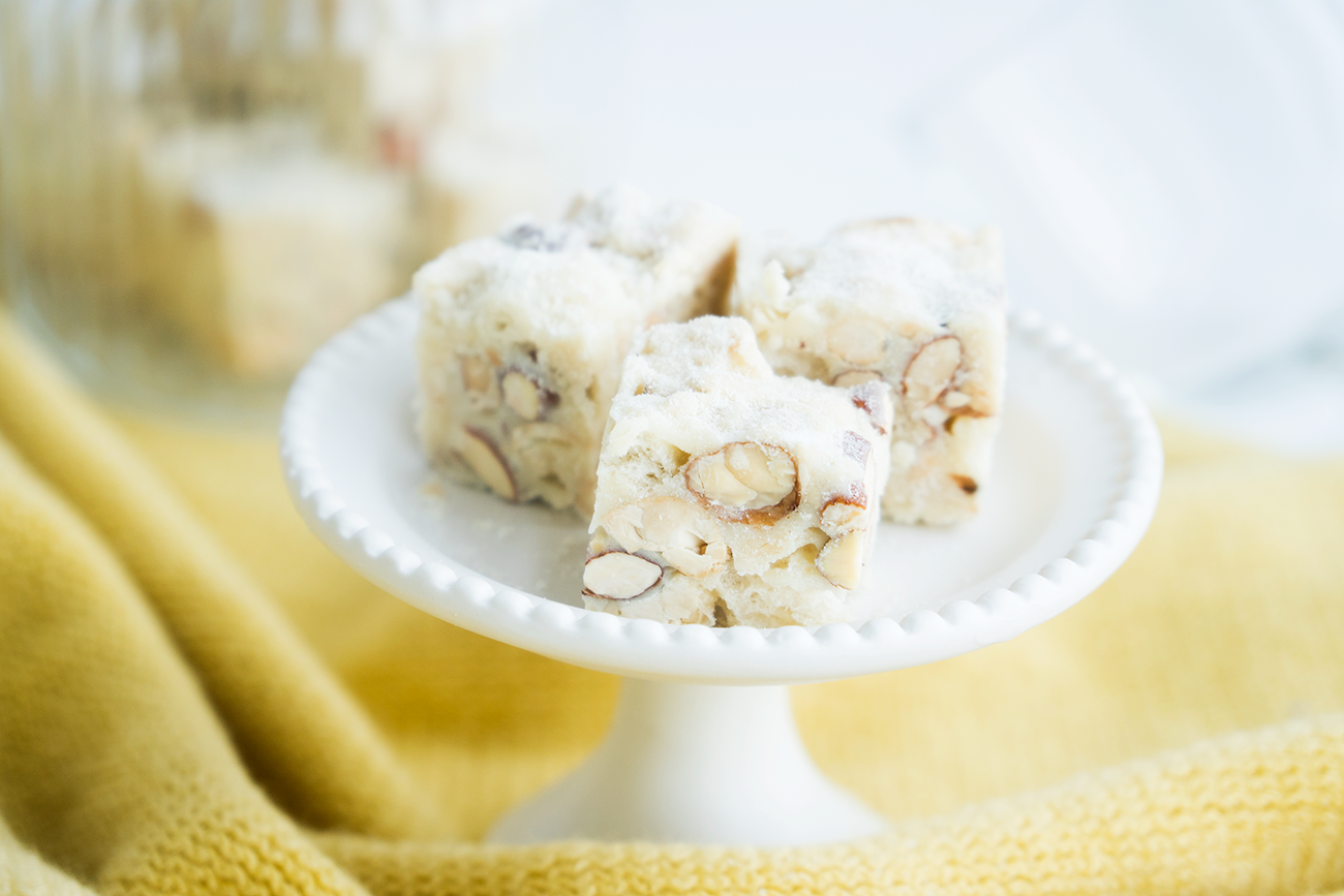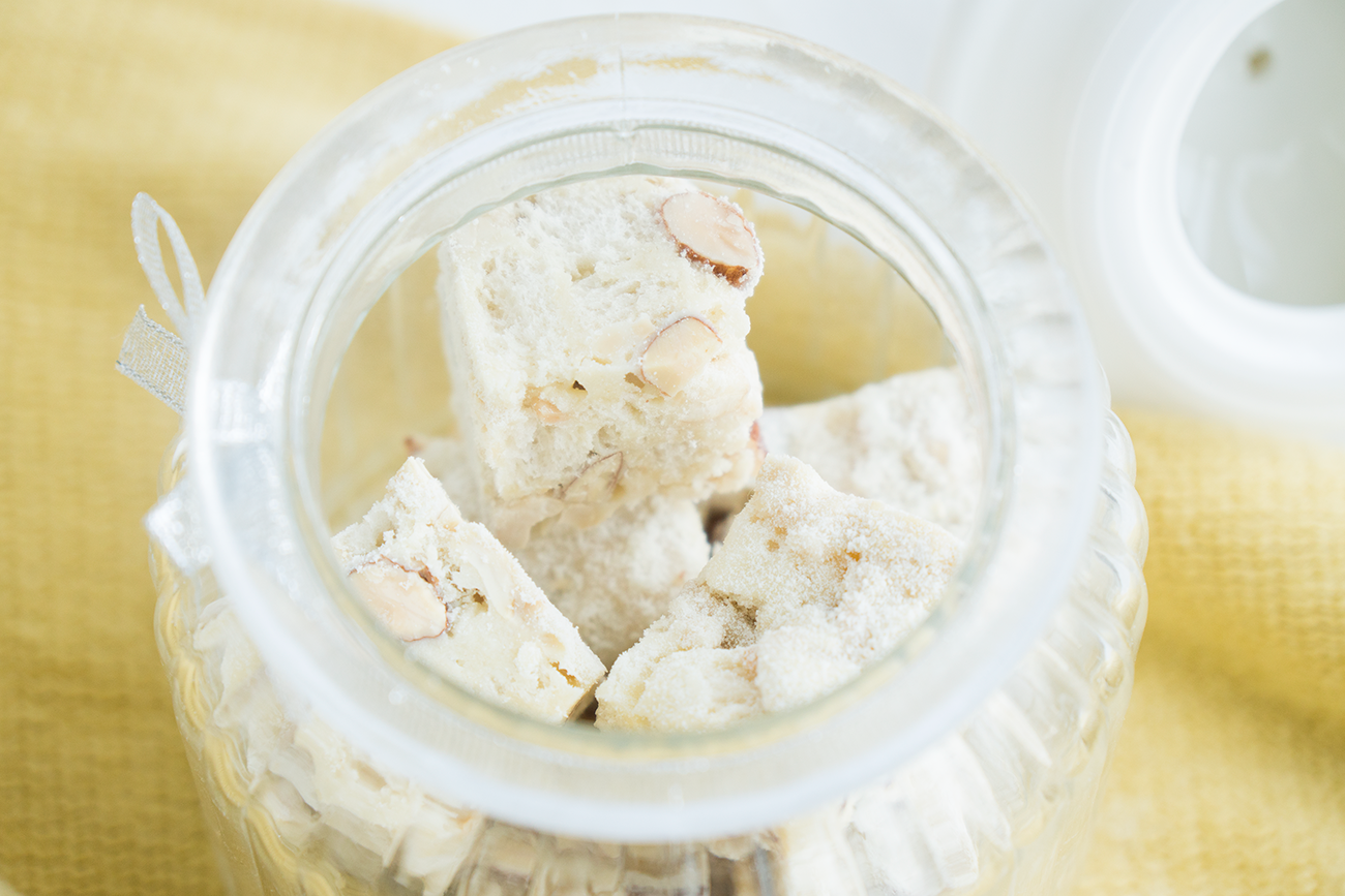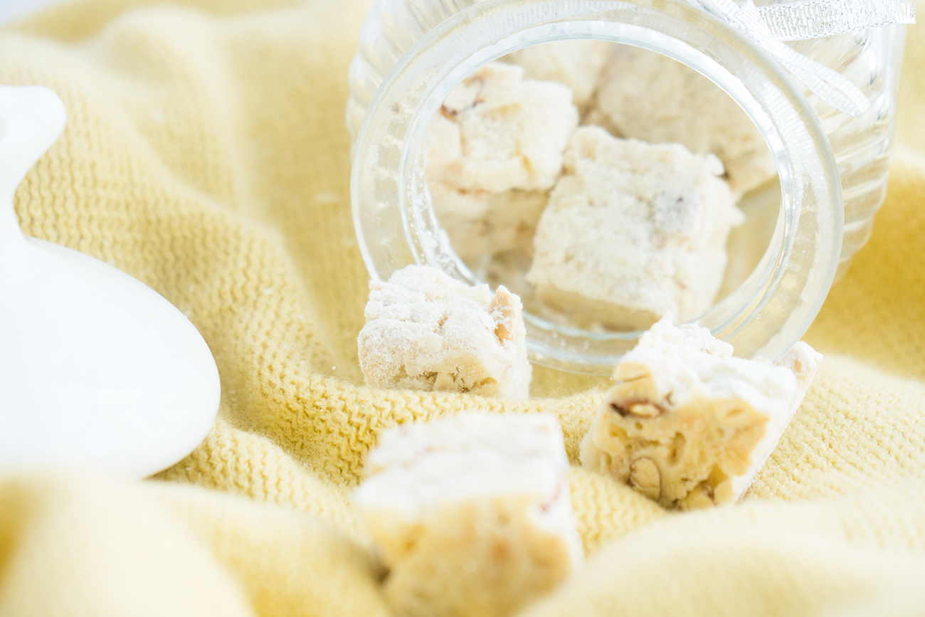 TIPS: 1、相比于什么小饼干,面包丁更易得,随手就能买到,只要烘干就好,不挑牌子;而且口感非常的棒,很酥松,如果家里有吃剩的蛋糕、面包,都可以烤干之后再利用,口感比饼干棒很多! 2、融棉花糖一定要小火小火,融好之后立刻倒在辅料上,越凉越难拌。如果家里有很大号的不沾锅,则可以把备好的辅料直接倒进去翻拌,只是这样出来的糖液会稍稍偏黄,因为关火后锅子仍然在持续加热; 3、如果想做别的口味或颜色,比如抹茶/紫薯味,去掉5g奶粉,换上等量的抹茶/紫薯粉,这个粉是加入小锅中,和棉花糖液混合均匀后倒出来使用; 4、掌握好基本的比例就可以自己随时变量:棉花糖+黄油的分量=所有坚果干的分量;黄油:棉花糖是1:4,奶粉与黄油永远等量。有了公式是不是觉得超简单,不看分量也可以随时做了!