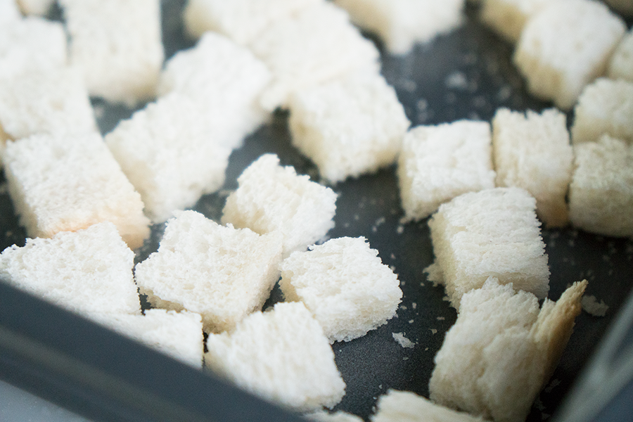 白吐司先切片,去掉四边后再切成小块,放进烤箱中120℃烘丁,注意温度不要太高,否则会上色;