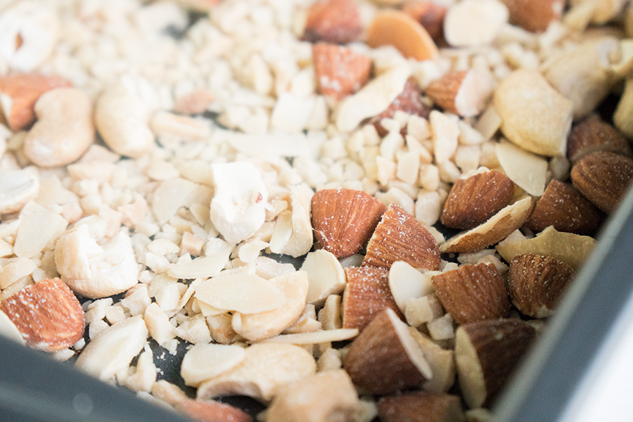 杏仁、腰果140℃烤30分钟爆出香味,再放入花生碎与杏仁片,再烤10-15分钟,不要让食材烤上色;特别提一下,杏仁腰果本身比较大颗,建议可以一分为二再使用,虽然这样做比较麻烦,但最后切分时会很轻松;