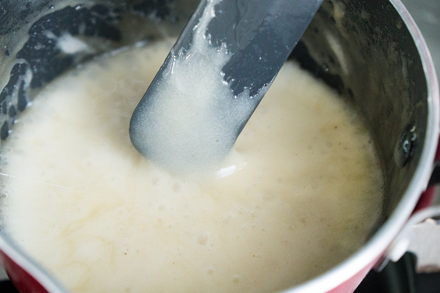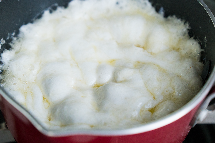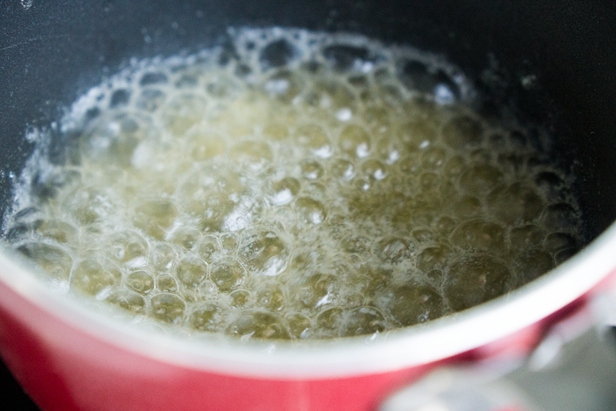 黄油加入小锅中融化,融好后调小火,加入棉花糖;