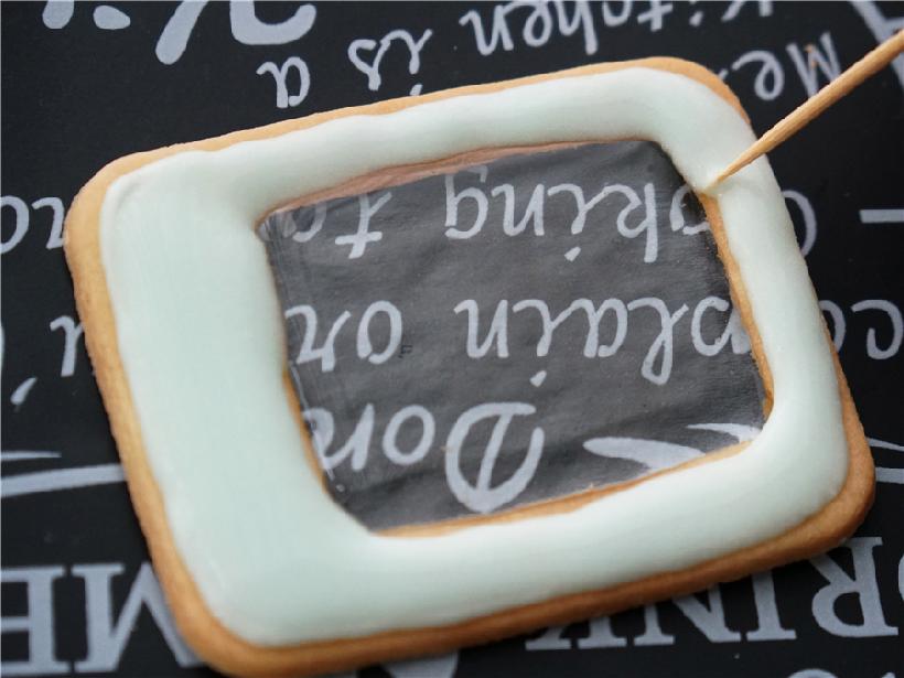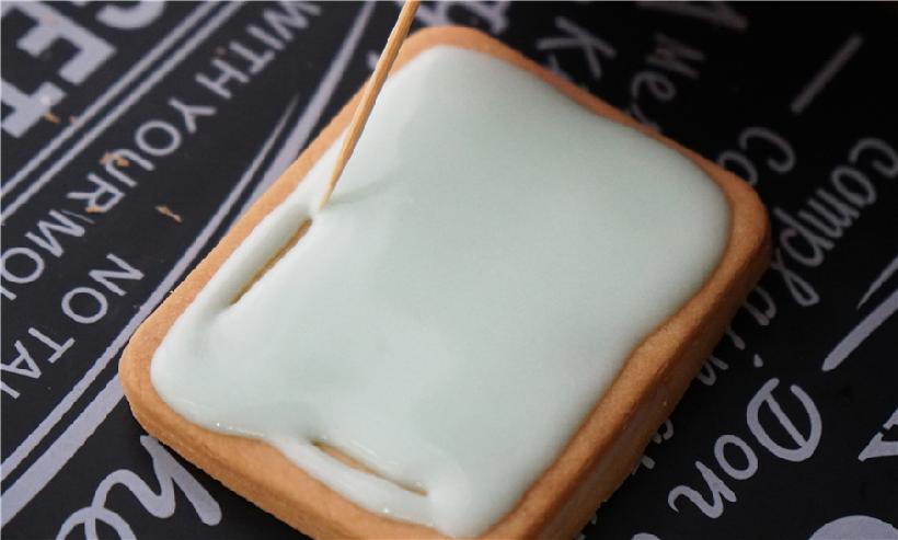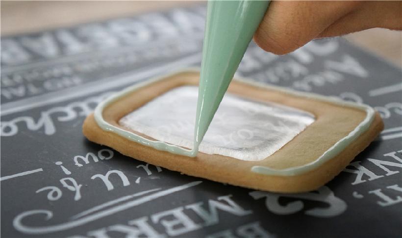 取出刚才浇了糖浆的空心玻璃饼干,和作为背面的实心饼干。先给饼干描个边(空心位置的外边也要描);再将中间填满,有缝隙或边上不平直的话就用牙签画圈抹平;常温放置3小时晾干,注意保持环境通风。实心饼干也一样,先描边再把整个背面涂满绿色。