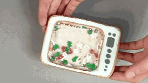 晾干后在中间空心处倒上糖珠等装饰物,注意糖珠的厚度不要超过夹层饼干的厚度;夹层饼干表面涂糖霜(尽量靠近饼干外沿),把作为顶面的饼干盖上去粘住,如果看到饼干侧面有洞,不能完全粘住,就再把有洞的地方用糖霜补上,保证糖珠不会从里面漏出。然后放置晾干即可;一个萌萌哒迷你烤箱就做好啦!再配上迷你手套、小刮刀~~