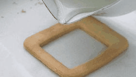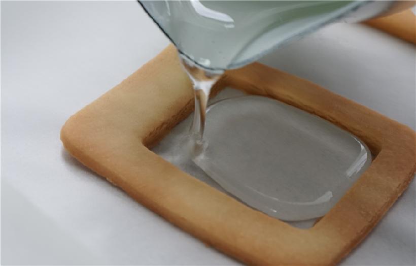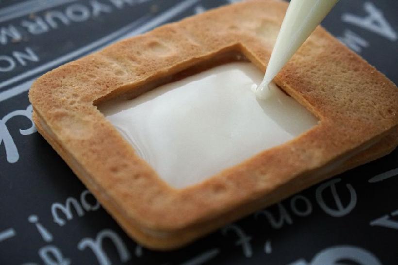 将糖浆缓缓倒入饼干的空心处。烤箱饼干的空心处较大,建议横向画Z字形倒,尽量一次倒好;