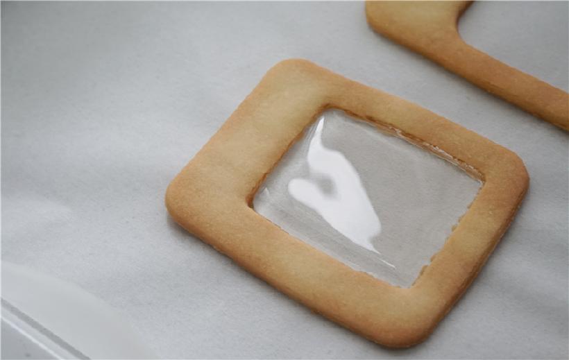 TIPS: 关于玻璃的制作: 1、玻璃的制作使用的是艾素糖(淘宝就能买到),也可用普通细砂糖。还有一种做法是用市售硬糖,敲碎后铺在未烘烤的饼干胚空心处,直接连同饼干胚拿去烘烤。不过这种方法不是很好把握饼干的烘烤程度,有可能饼干烤好后糖还没化,或者饼干还没好糖就烤焦了; 2、艾素糖做的玻璃对空气湿度有较高的要求,在湿度较大(40%以上)的情况可能会受潮变雾、表面发粘。所以建议大家在湿度不过高的环境下操作,不然的话玻璃糖晶莹剔透的样子可能只能保持一天。操作时也要注意不要碰到玻璃糖,以免留下指印; 3、 待整体糖霜部分完全晾干才可以密封保存!否则糖霜的湿气会让玻璃糖很快受潮; 4、倒糖浆的时候我们底下铺的是油纸,但如果大家有表面非常光滑的油布,那么用油布会更好;
