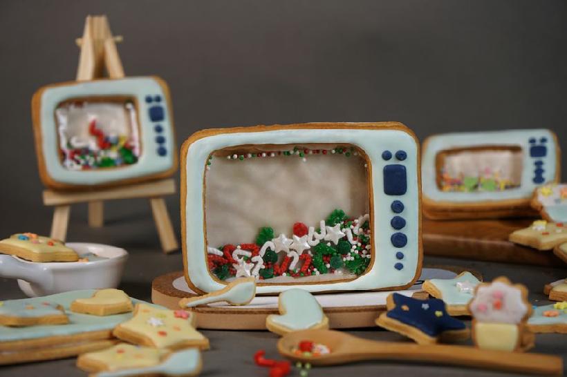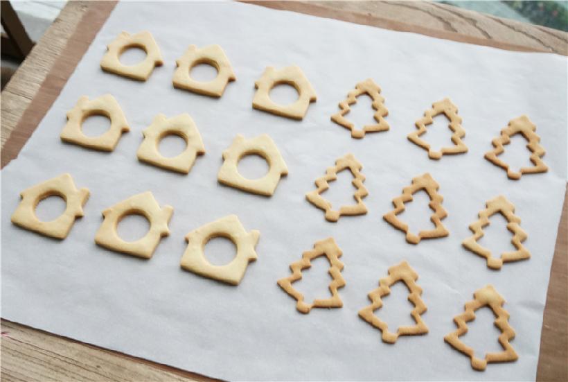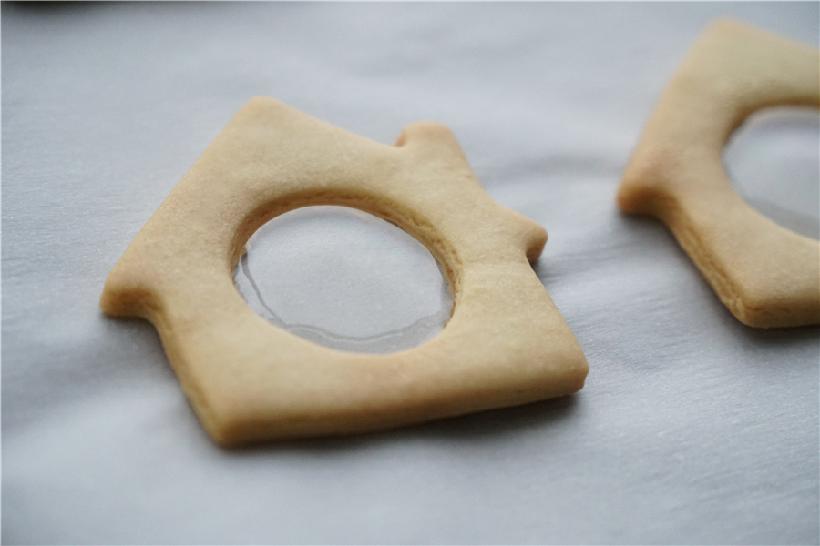TIPS: 关于组装: 1、这款饼干必须至少是三片一组的(一片实心、一片空心、一片空心玻璃),不然中间无法放糖珠。大家在制作饼干胚的时候需要算准分量,做一组就扣2片空心,1片实心。做两组就扣4片空心,2片实心。以此类推; 2、如果想要在里面放更多的糖珠装饰,可以每组多加一片夹层饼干,即每组4片饼干,其中含1片实心、2片空心、1片空心玻璃。 3、如果大家想做空心饼干又觉得烤箱形状太过复杂,也可以用家里现有的模具制作,一样非常可爱!