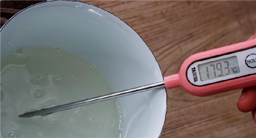 糖浆到达温度后立刻离火,放在湿抹布上,轻轻摇晃锅子十几秒,直到糖浆无泡或只有几个小泡。注意不可等待太久,以免糖浆凝固;