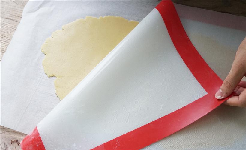 tips: 关于饼干胚的制作: 1、擀面团时建议在揉面垫上操作,并且擀面杖直接接触面团,不要隔着油纸擀。这是为了让饼干胚在擀好后不会被油纸压出明显的折痕; 2、擀好的面团建议直接在油纸上扣出形状,然后整个把油纸转移到烤盘中进行烘烤,这是为了不让扣好形状的饼干胚在移动到油纸时变形。由于擀开面团时使用的是揉面垫,因此需要将擀好的面团转移到油纸上,方法如下: ①油纸完全覆盖并贴住面饼,同时捏着油纸和揉面垫的边沿翻转; ②轻轻掀起揉面垫,此时面饼背面朝上; ③ 按上面的方法再盖一张油纸翻转即可; 3、油纸一定要铺平,不然饼干烤好后边角会翘起;