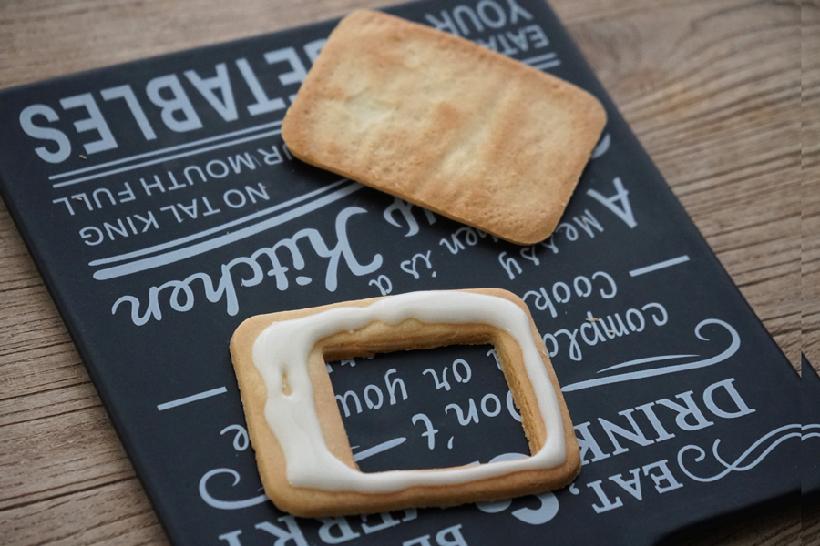 糖霜晾干之后,我们就可以开始最后的组装了:裱花袋中装入剩余的白色糖霜,剪出小口;取出作为底面的实心饼干和作为夹层的空心饼干,用糖霜粘住,静置几分钟晾干;底和夹层黏好后,再涂白色烤箱内腔,让成品看上去更精致~