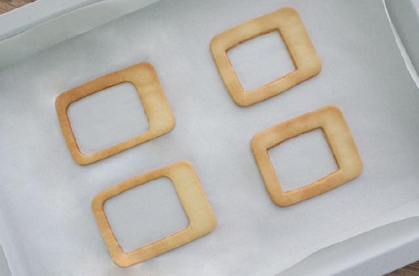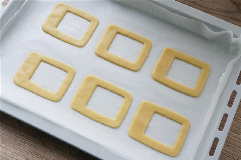 饼干坯冷藏好后从冰箱取出、整型、擀开;找出两个大小不一的模具,我用的大的是明信片盒盖、小的是茶叶盒盖。 扣好之后把边上和空心部分多余的饼皮掀掉,可用牙签辅助;