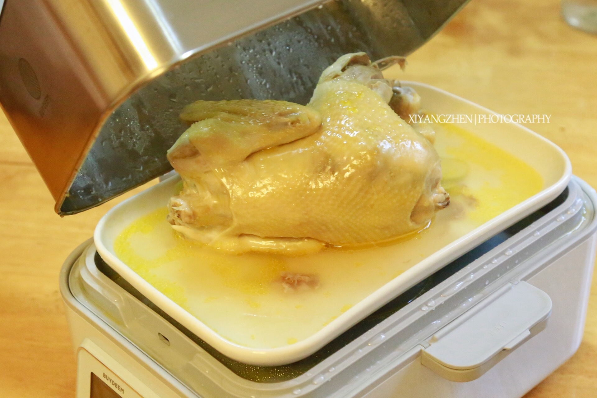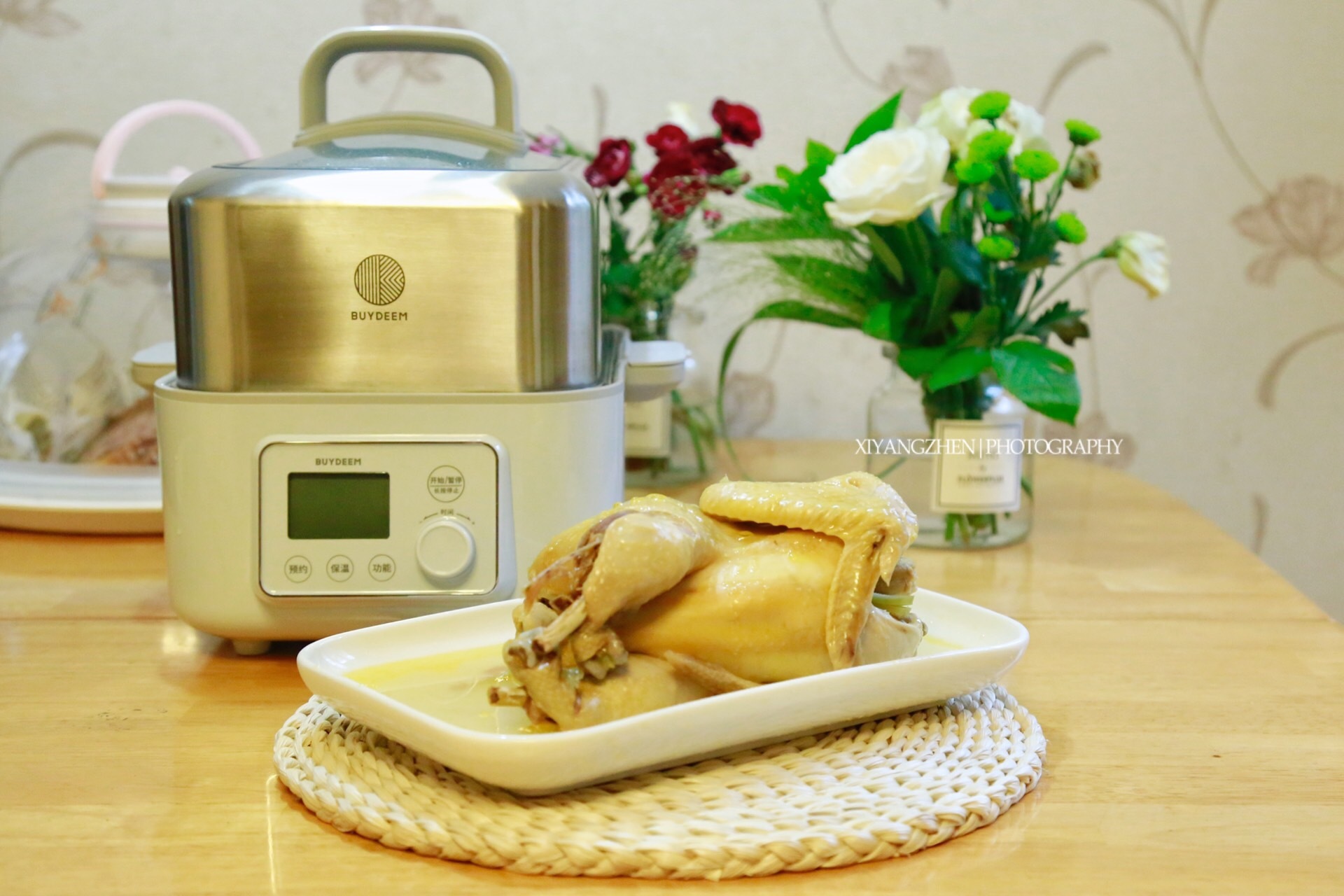 3.准备完毕就可以开始蒸了,用的是北鼎蒸炖锅,加水至“最大”水位,开“蒸”档,定时40分钟。